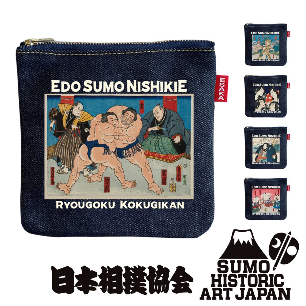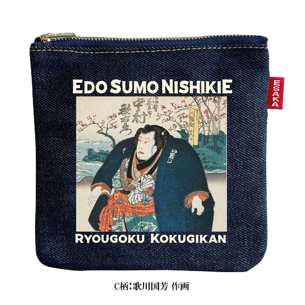 Edo Sumo Ukiyo-e × Esaka Jeans Mini Denim Pouch – Made in Japan Featuring Indigo Denim from Okayama | Japan Sumo Association Approved 江戸相撲錦絵×江坂ジーンズ 浮世絵 日本製 デニムポーチ made in Japan 日本相撲協会承認 | 日本のお土産手ぶら