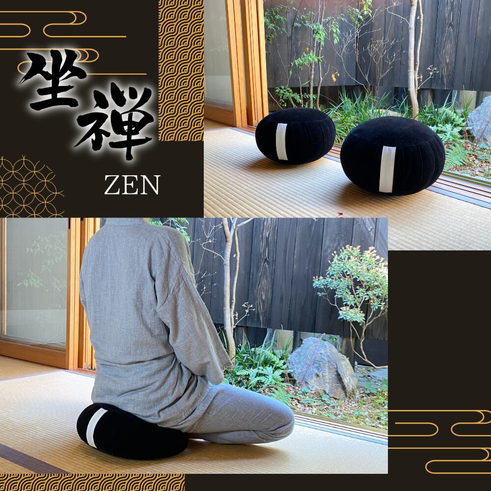 This cushion is specially made for zazen (seated Zen meditation). It is placed beneath the body to support a stable, upright posture during practice, and is the same type used in temples throughout Japan.